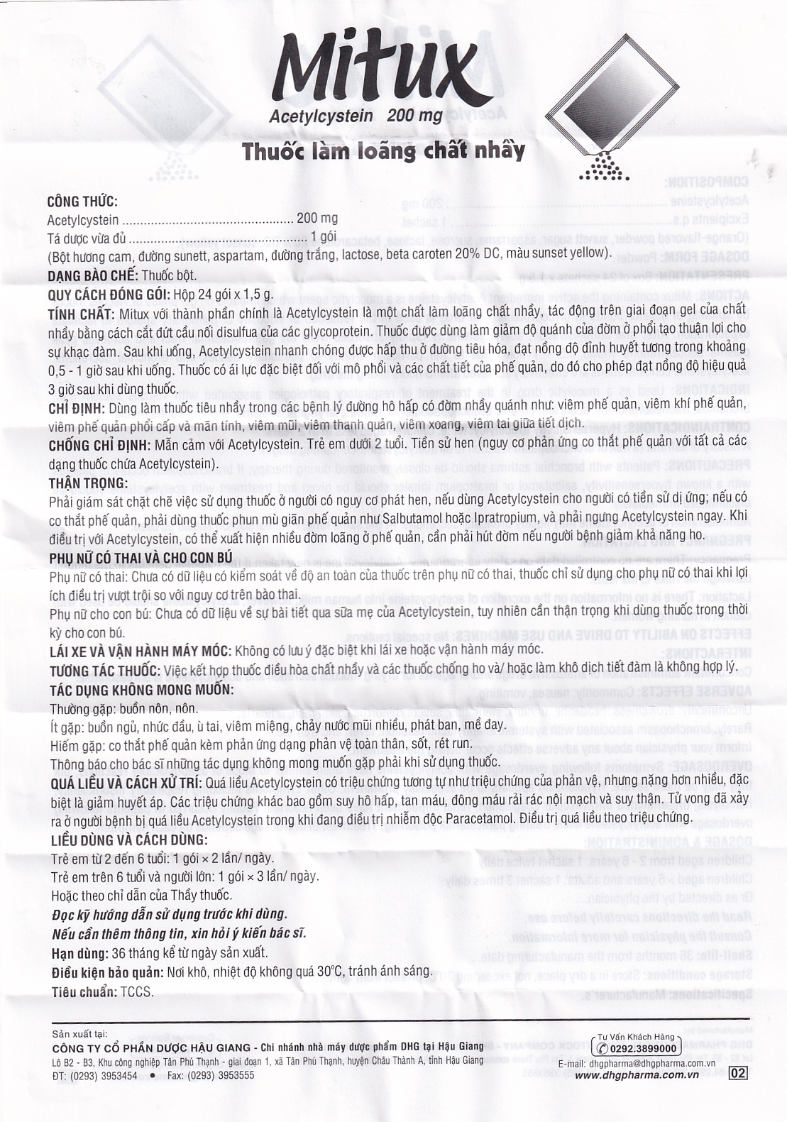 Thuốc Mitux 200mg là sản phẩm của Công ty Cổ phần Dược Hậu Giang và có thành phần chính là acetylcystein. Đây là một hoạt chất rất hiệu quả trong việc tiêu chất nhầy, giúp làm loãng đờm trong các bệnh lý đường hô hấp. Sản phẩm này được bào chế dưới dạng bột uống, rất dễ sử dụng.