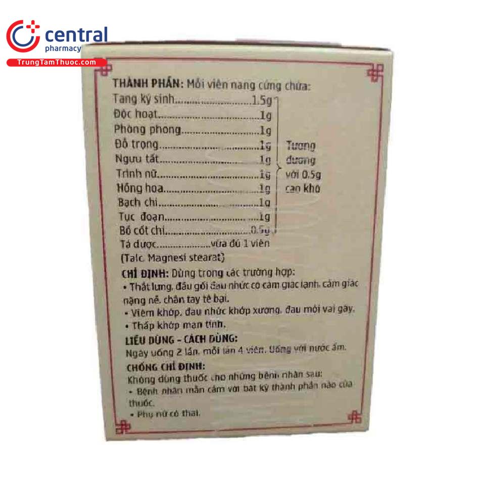 Đặc biệt, Tang ký sinh (Herba Loranthi gracifilolii) với 1,5g là thành phần chủ đạo, giúp mạnh gân cốt và bổ thận. Bên cạnh đó, các vị thuốc như Độc hoạt, Đỗ trọng, Hồng hoa cũng có mặt, mỗi loại 1g, góp phần giảm đau và tăng cường sức khỏe xương khớp.