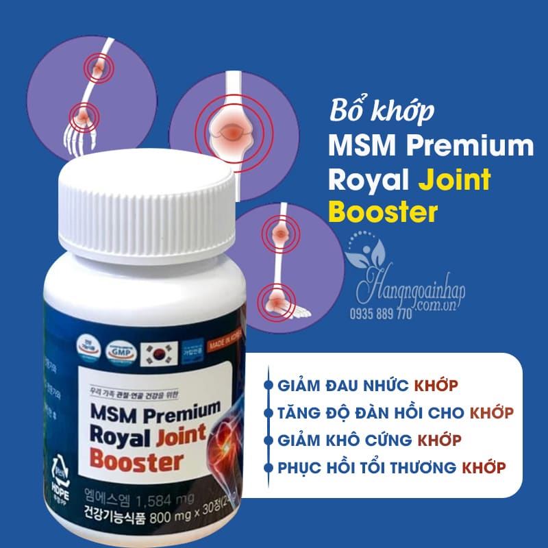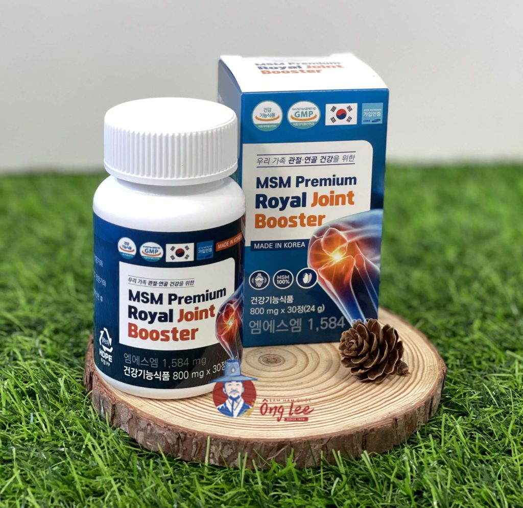 MSM Premium Royal Joint Booster là sản phẩm bổ khớp nổi bật của Hàn Quốc, được sản xuất theo quy trình hiện đại để đảm bảo chất lượng cao nhất. Mỗi viên thuốc chứa đến 800mg MSM nguyên chất, giúp hỗ trợ sức khỏe xương khớp một cách hiệu quả. MSM, hay Methyl Sulfonyl Methane, là hợp chất lưu huỳnh hữu cơ có vai trò quan trọng trong việc duy trì tính đàn hồi và linh hoạt của các cơ liên kết.